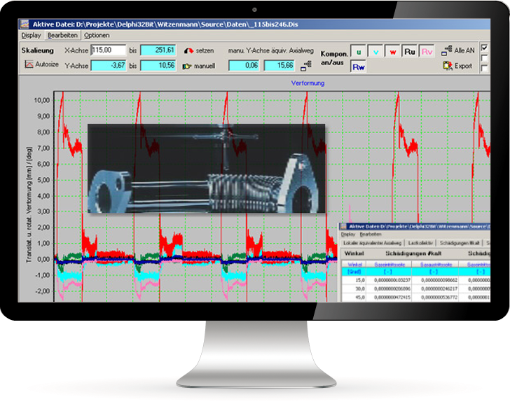 Das von ZiWu-Soft entwickelte Programm DisFat V4 wird für die Betriebsfestigkeitsanalyse dieser Entkoppelelemente eingesetzt. In einem ersten Schritt werden hiermit die im Fahrzeug gemessenen Daten in Verformungen transformiert und visualisiert. Im zweiten Schritt werden für einzelne Entkoppelelementkomponenten über einen Abgleich der ermittelten Beanspruchungen mit der Beanspruchbarkeit die daraus resultierenden Schädigungsbeiträge ermittelt. Diese Schädigungen lassen sich unter Berücksichtigung der Anforderungen von den Kunden von WITZENMANN, wie z.B. BMW, Peugeot, usw. extrapolieren und abschließend bewerten. Als Ergebnis erhält man eine Aussage darüber, ob das Entkoppelelement im Hinblick auf die Lebensdauer für den Einsatz im Fahrzeug geeignet ist oder nicht.